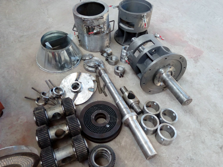 是把模輥付輥輪設(shè)計成圓錐體,從而使模輥之間接觸線上各點線速度相等,輥輪在平面上滾動而不滑動,減少阻力,延長使用壽命。在模輥付中,通過模板轉(zhuǎn)動或是支架轉(zhuǎn)動實現(xiàn)輥輪沿模板平面做相對運動,物料則在模輥之間進行擠壓,由旋轉(zhuǎn)輥輪強迫通過模孔成型。